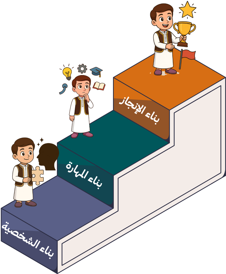 في "معسكر اكتشاف"، لا نعلّم مهارات فقط، بل نبني تجربة متكاملة ترتكز على 3 ركائز أساسية ومترابطة تضمن تطور ابنك بشكل متوازن: